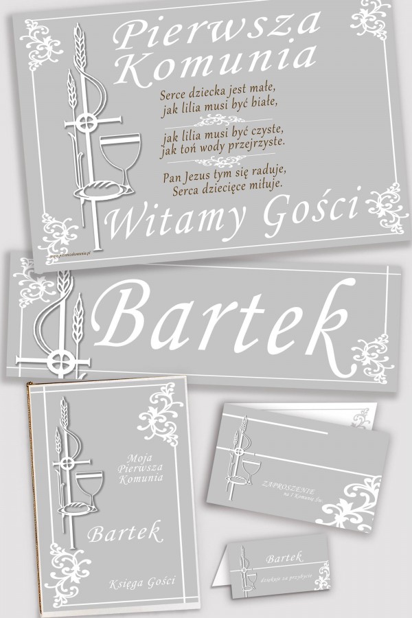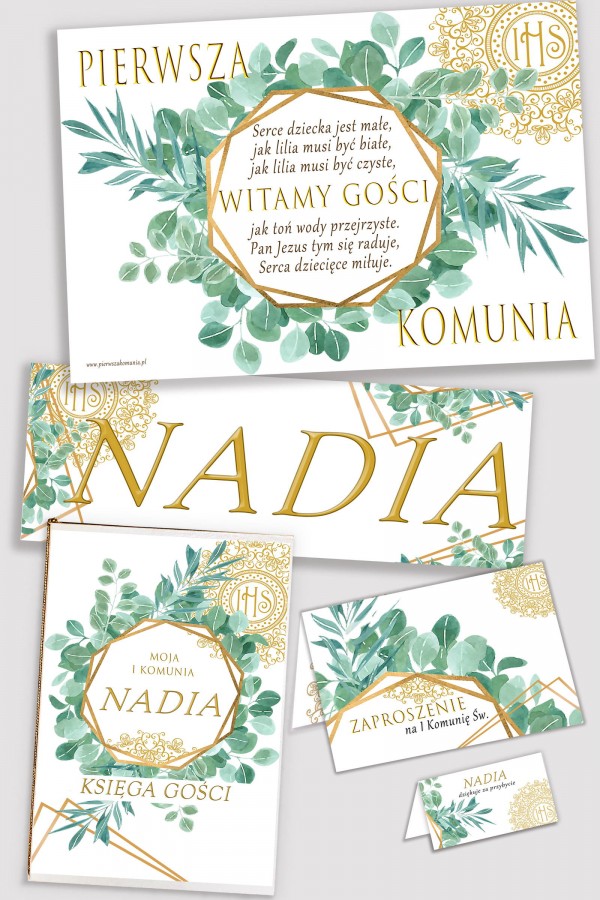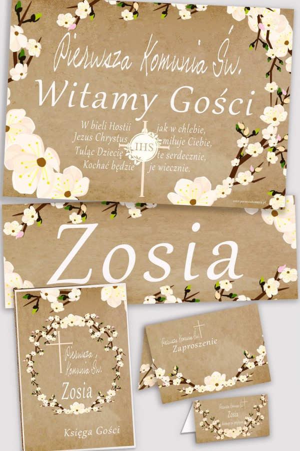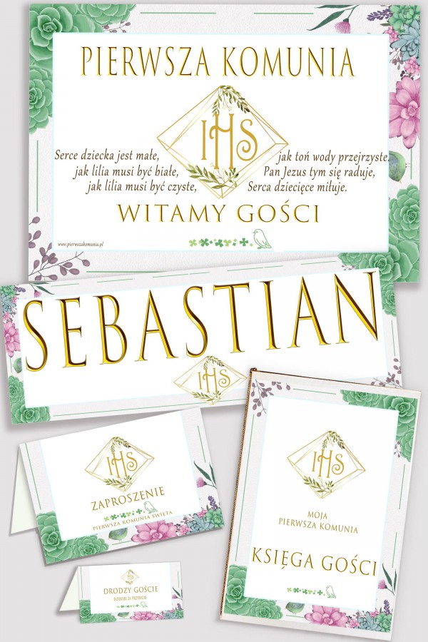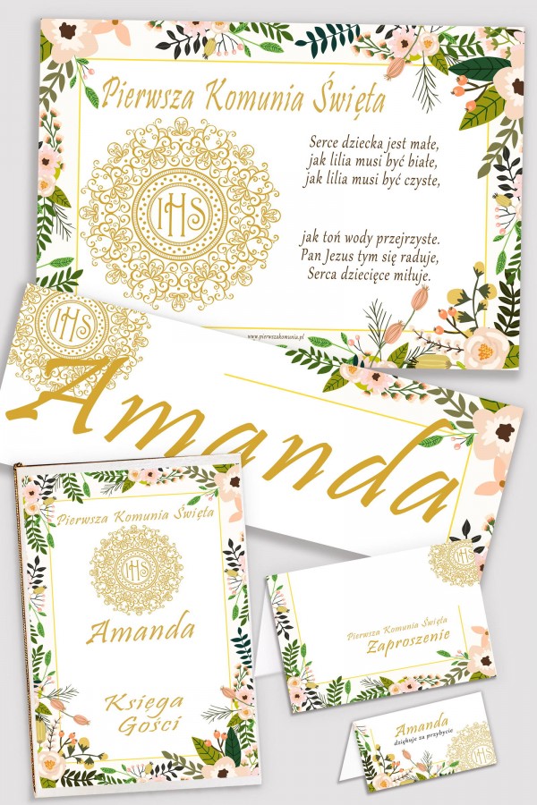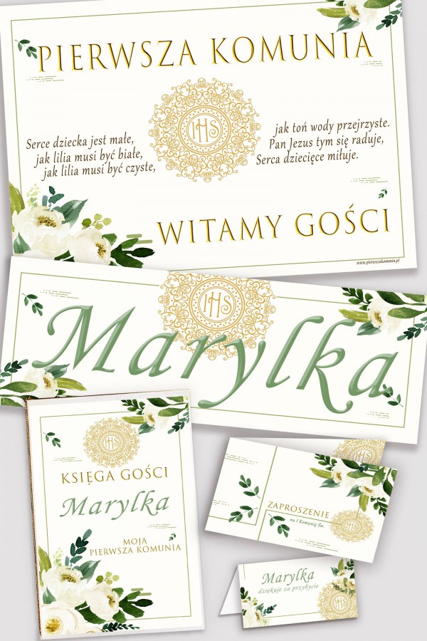 In our offer you will find personalized communion sets, consisting of five elements in the same style: a memorial book, a poster, a print with the child's name and a set of vignettes and communion invitations. Everything was designed by our graphic designers with great precision and attention to detail. In our store we have a wide selection of floral, floral and minimalist motifs that will perfectly fit the atmosphere of the party. Personalized decorative communion sets are very important on such an important day for the child and his parents. That's why we do our best to make the First Holy Communion memorable for a very long time for everyone.