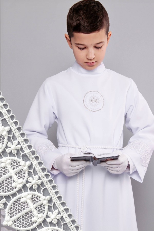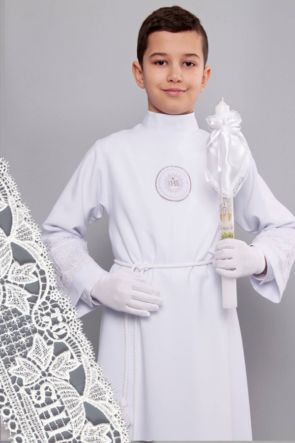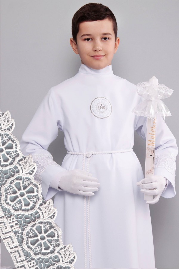 Extended communion robes are sewn for all children - both girls and boys look very elegant in them. We produce them from such fabrics as gabardine, georgette, but you should check whether the model you choose has in the options of choice all the mentioned materials (there are cuts sewn only from gabardine). Albs have collars or hoods. There are also albs that zip up in the front. Some have large, embroidered or cone-style collars, sleeves trimmed with guipure, satin belts and cords. There are interesting prints (IHS, Our Lady of Czestochowa, Heart of NPJ).