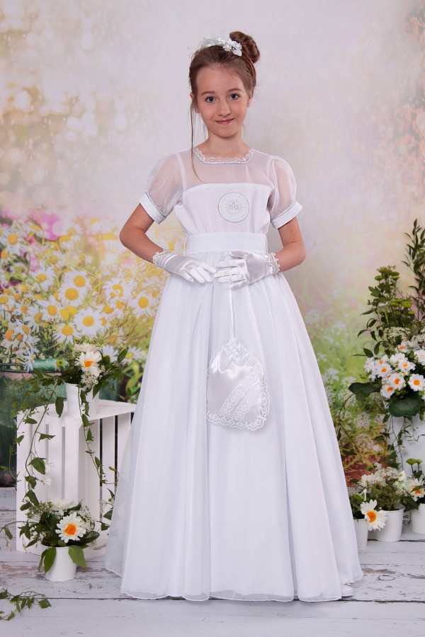 An embroidered emblem is a very important part of the decoration of communion albs or accessories such as First Communion bags or candle drippers. The photo shows an article from the category: Communion hosts, alb patches for girls and boys.