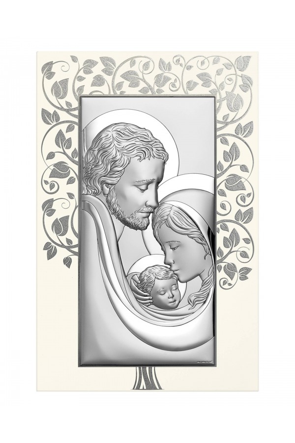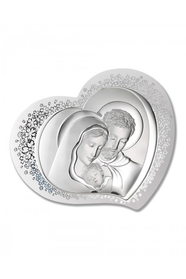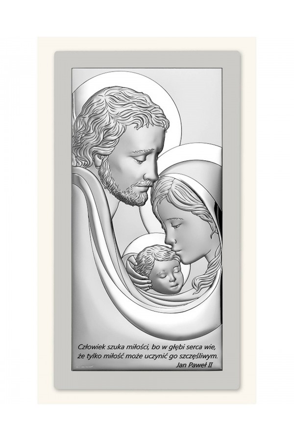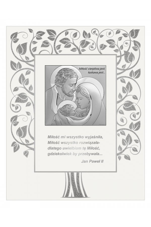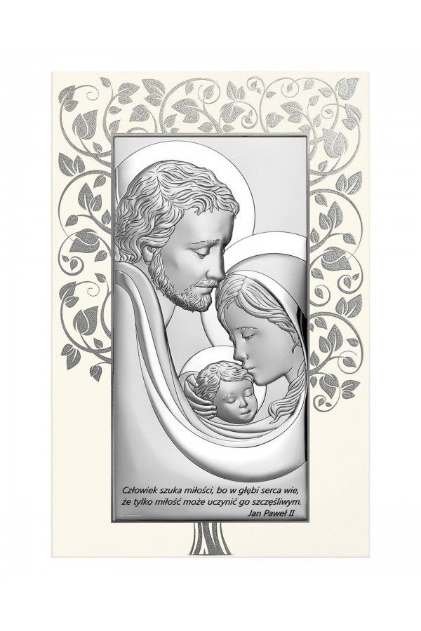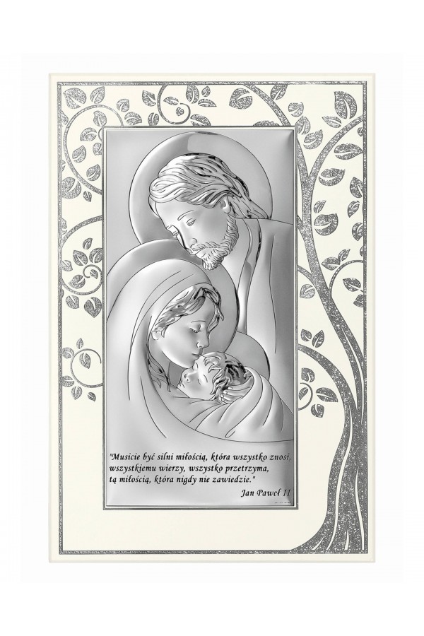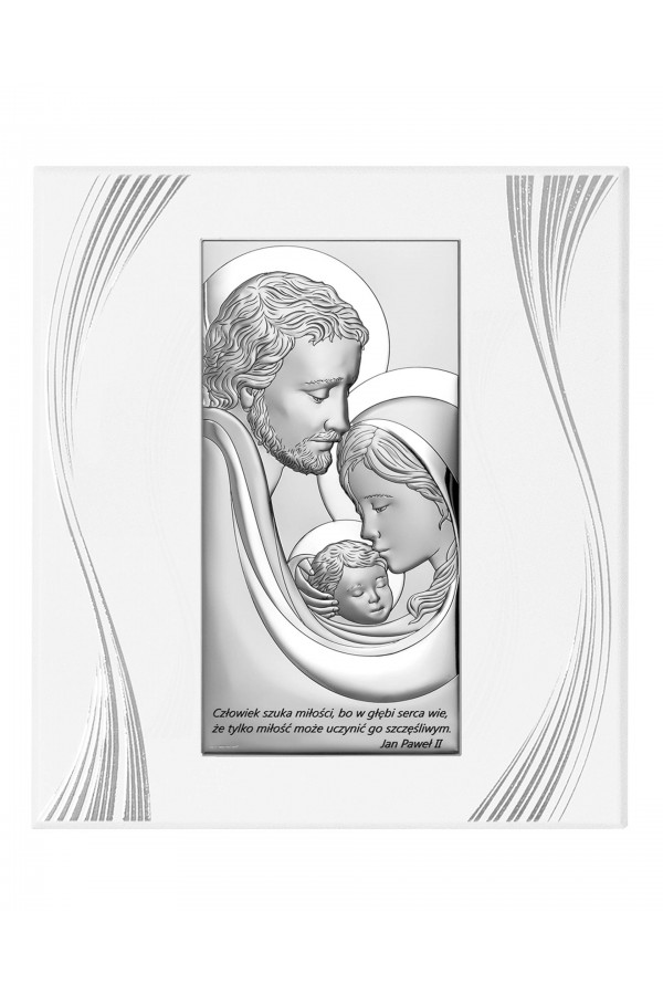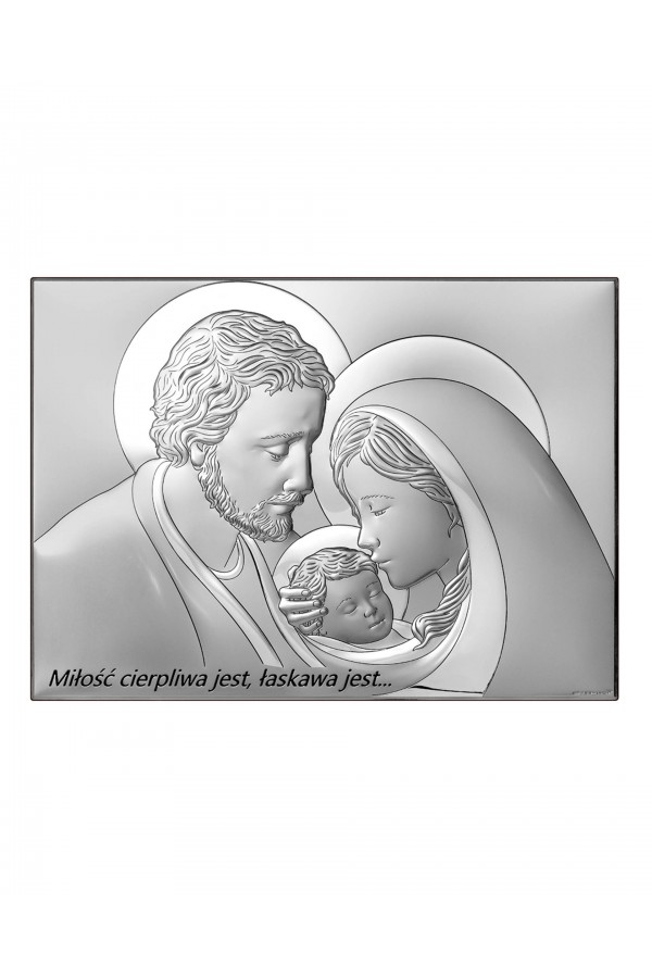 Silver communion souvenirs with engraved or embossed images of saints are a very popular gift given to children on the day of their First Communion. Particularly loved by children are the figures of angels and the Holy Family. Joseph, Mary and little Jesus symbolize family, faith, hope and home warmth, so their image on the picture is a very nice souvenir of receiving their First Communion sacrament. The bas-relief depicting the Holy Family is presented on the rectangular picture, as well as in the motif of a heart, cloud or plants, which is especially pleasing to children and reminds them of this special day for them.