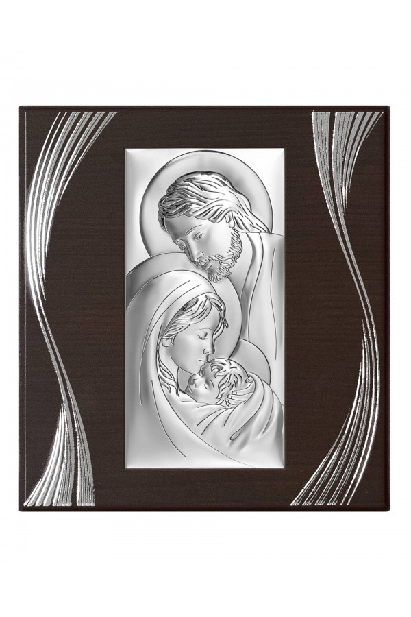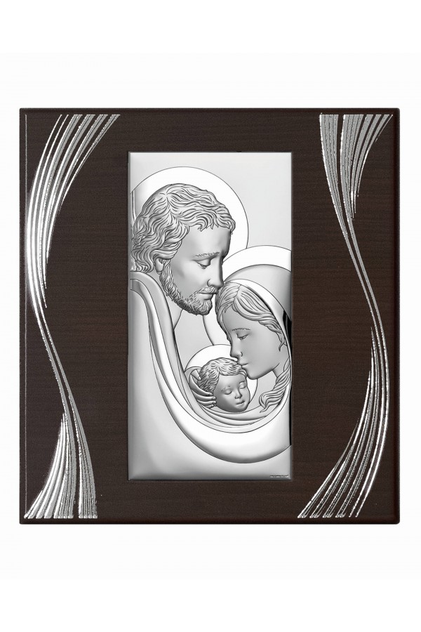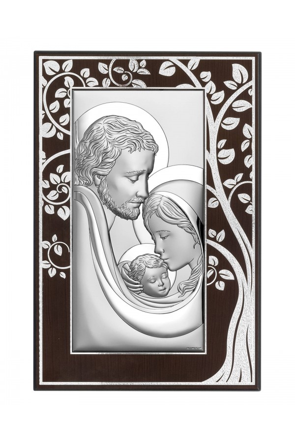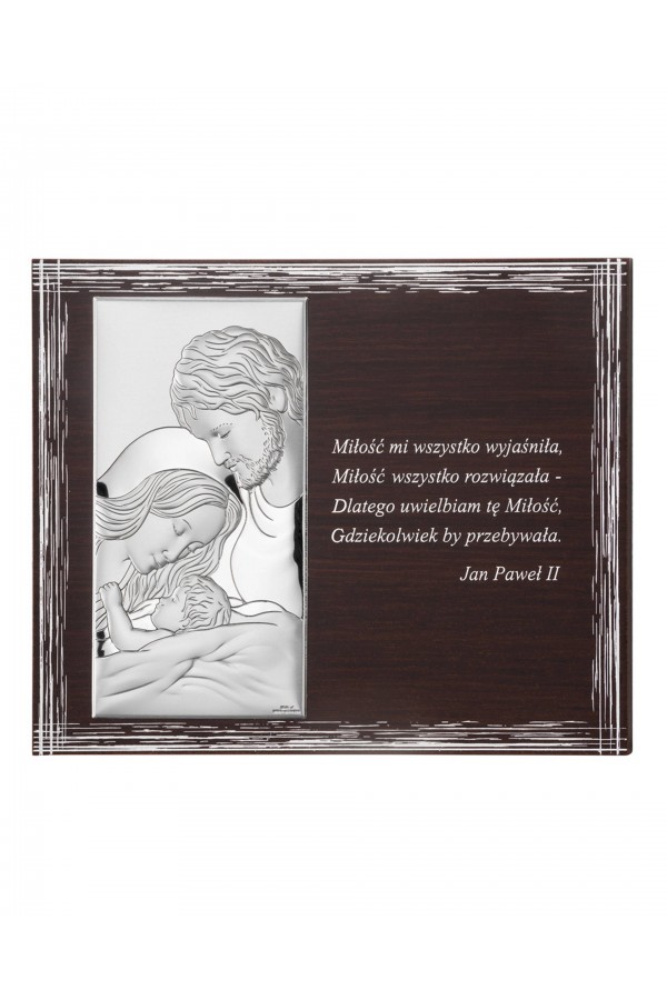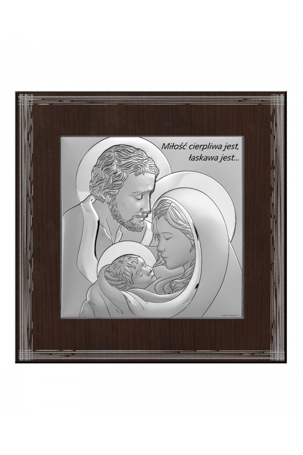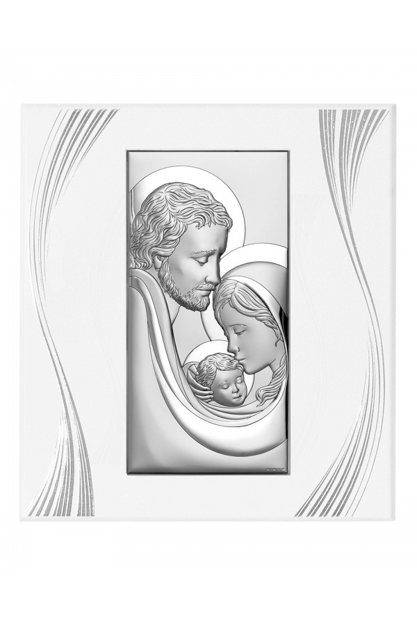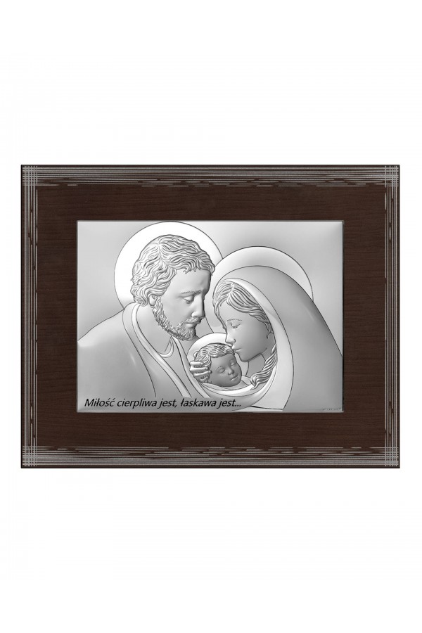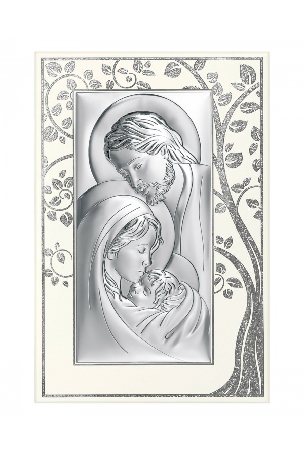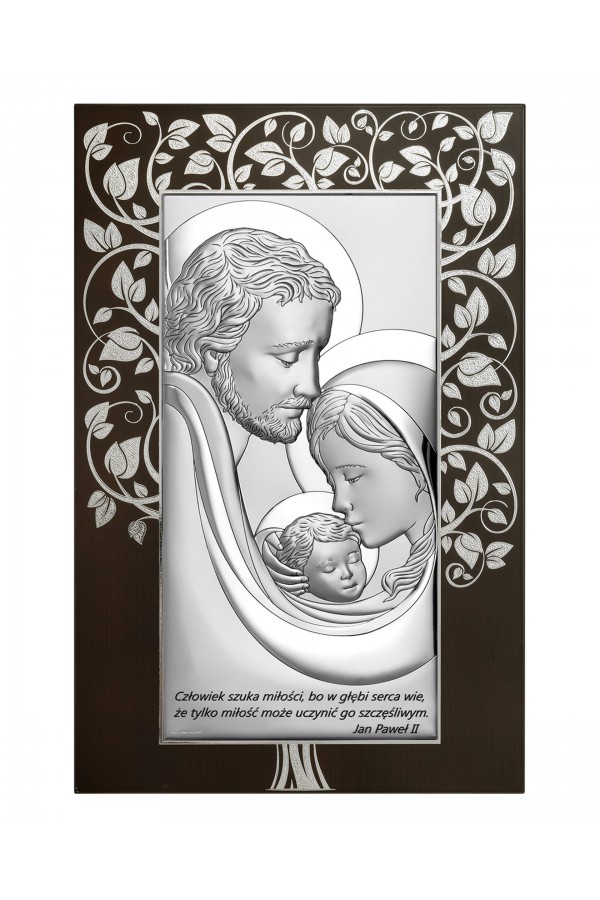 Silver communion souvenirs with engraved or embossed images of saints are a very popular gift given to children on the day of their First Communion. Particularly loved by children are the figures of angels and the Holy Family. Joseph, Mary and little Jesus symbolize family, faith, hope and home warmth, so their image on the picture is a very nice souvenir of receiving their First Communion sacrament. The bas-relief depicting the Holy Family is presented on the rectangular picture, as well as in the motif of a heart, cloud or plants, which is especially pleasing to children and reminds them of this special day for them.